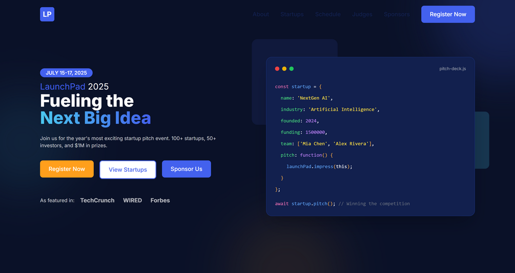 A sleek, fully responsive website template built with ReactJS and TailwindCSS, perfect for startup pitch events.